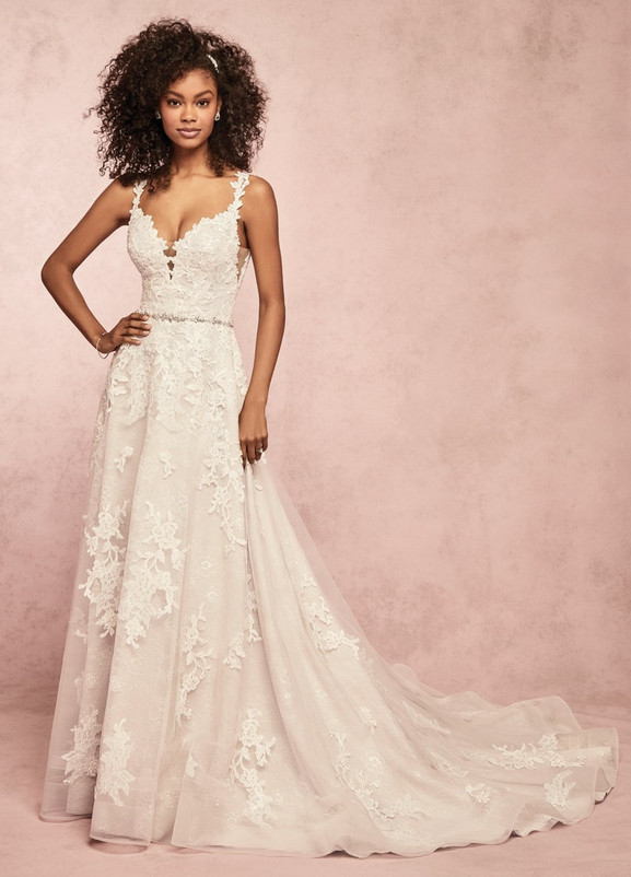 This A-line wedding dress features cascades of lace motifs over tulle and textured lace, with unique cutout lace motifs accenting the illusion plunging sweetheart neckline, straps, and V-back. Complete with illusion side insets and horsehair trim along the hemline. Finished with pearl buttons over zipper closure. Beaded belt accented in Swarovski crystals on grosgrain ribbon sold separately.