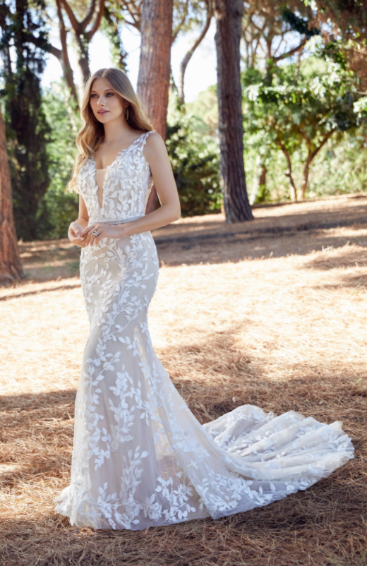 Gorgeous and glamorous unique patterned lace wedding dress, complete with a jersey slip dress and v neck line.Available in sizes 6 - 30