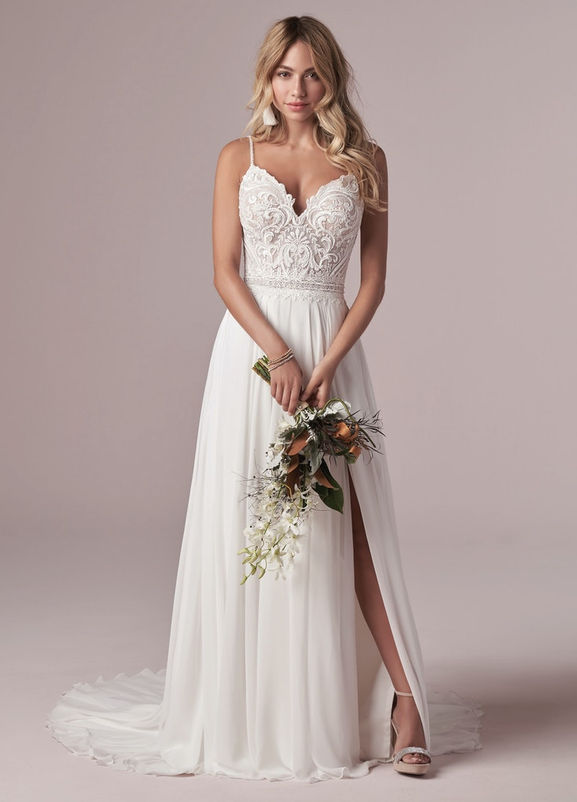 Hot dang-soft and dreamy makes a major statement in this V-neck chiffon sheath wedding dress. (Plus it's light and breathable for all kinds of weather.
