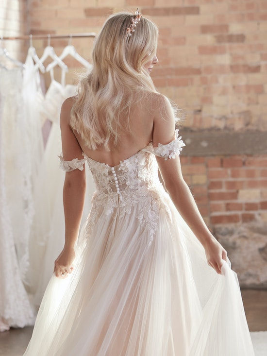 Reminiscent of wildflowers and watercolors. Undeniably whimsical. Pairs perfectly with a bright bouquet. (May we suggest something with lots of greenery?) A fairytale A-line bridal gown for a striking and feminine statement.
